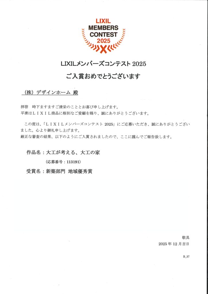 住宅施工例コンテストに応募し下記を受賞致しました。